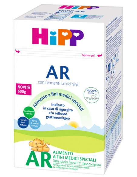 La formula a fini medici speciali HiPP AR è indicata per la gestione dietetica della patologia del reflusso gastro- esofageo nei lattanti (0-12 mesi) sotto controllo medico. Può essere utilizzata dalla nascita per l'alimentazione esclusiva del bambino e dopo i 6 mesi come parte di una dieta mista.